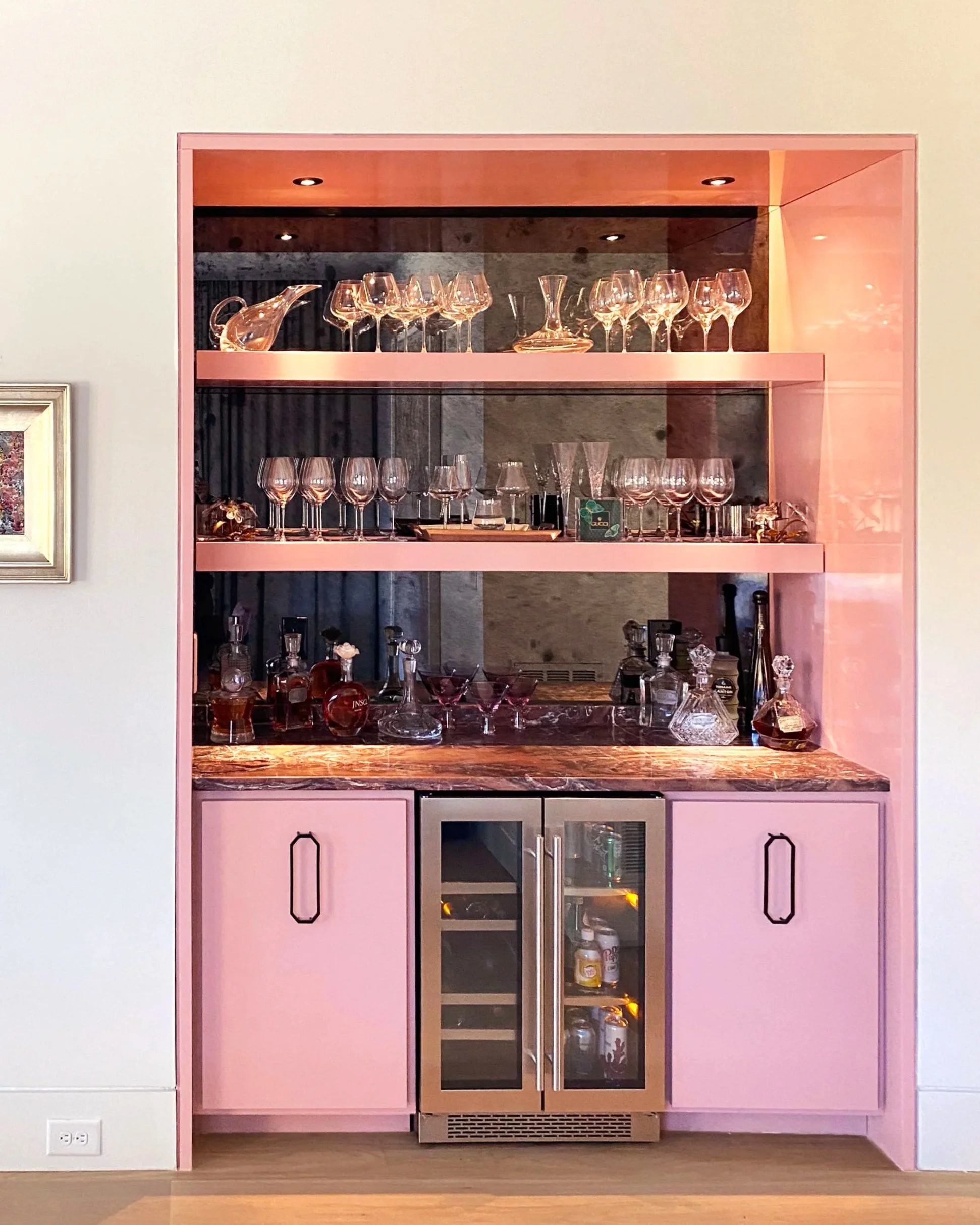 5) Dry bar with wine bottle pullouts, liquor drawer, marble countertop, single wine fridge opening, upper glass doors with LED lighting.