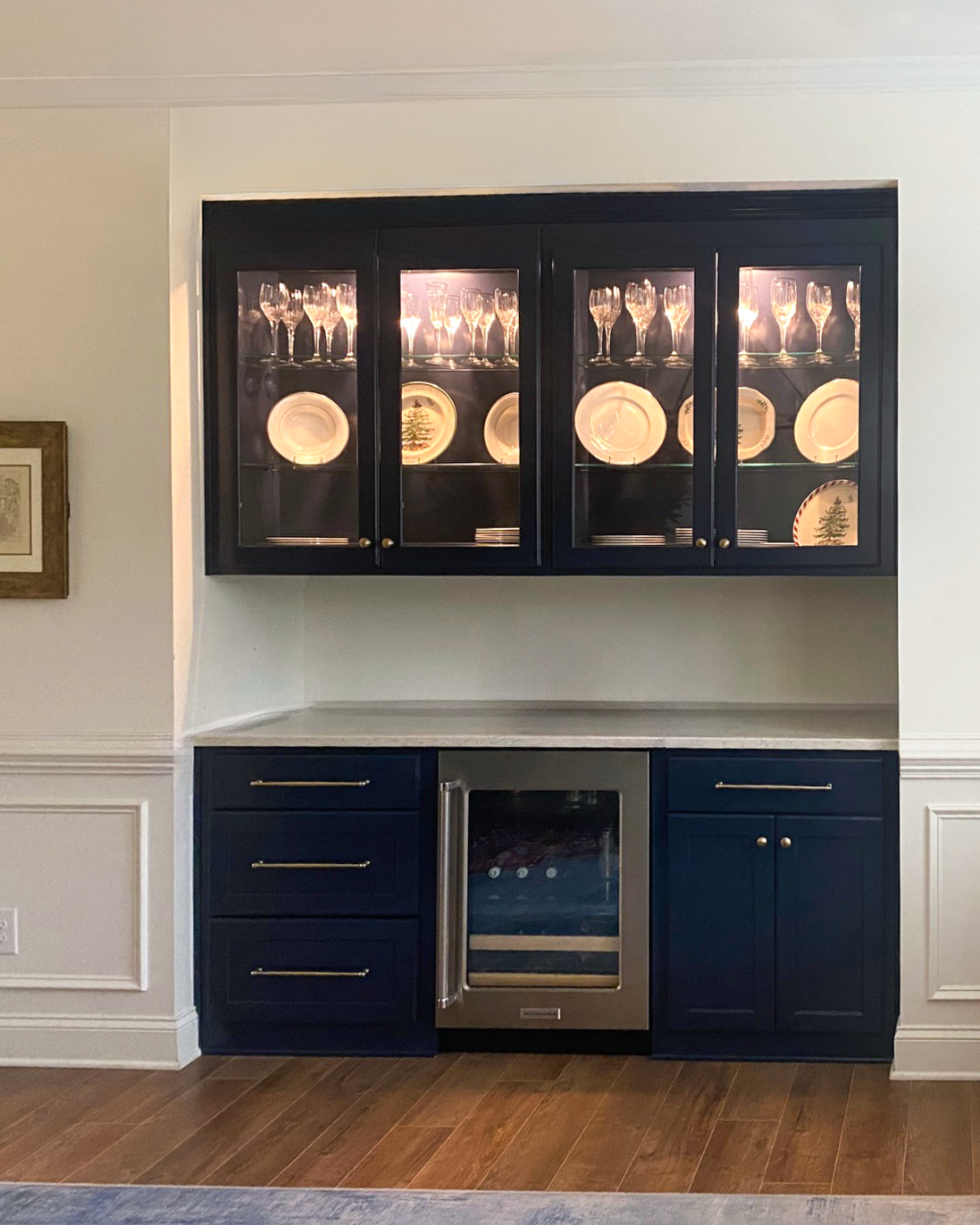 19) Dry bar with custom match glass doors, wine fridge opening, stain countertop and floating shelves.